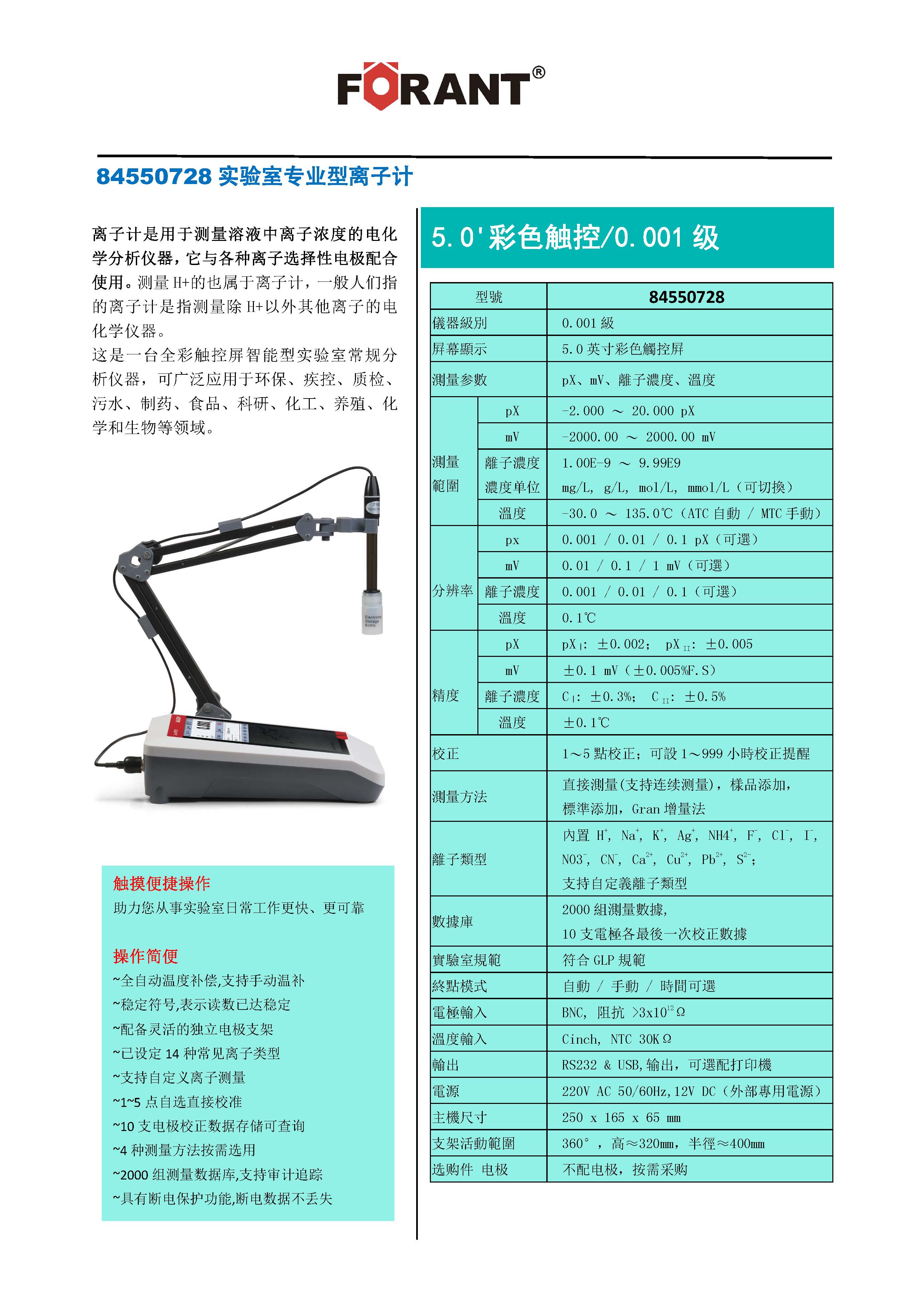 A30555 84550728 0.001级 5.0英寸彩色触摸屏 p×值/离子浓度值/mV/温度值 0.000~14.000p× -1999.99~1999.99mv (0-19990),μg/L,mg/L,g/L,mol/L,mmol/L -5.0~130.0℃ 0.01p×,0.001p× 0.1mv,0.01mv 0.1℃ p×Ⅰ:±0.002p×; p×Ⅱ:±0.005p×Ⅱ 0.1mV,0.01mV ±0.5℃ ±0.1℃ 300组测量数据 PC连接及打印机 RS232,USB 外部电源9V/1A 21125.00