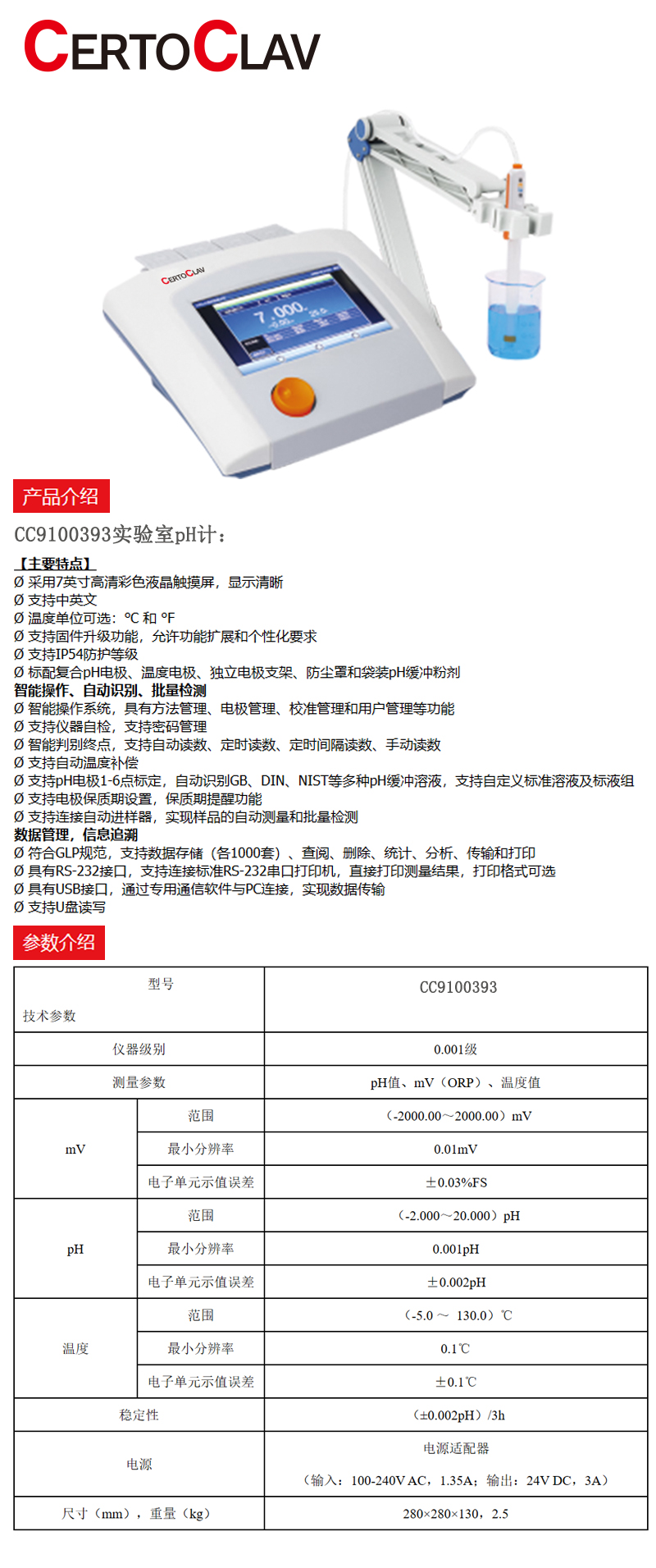 规格:  pH范围:(-2.000~20.000)pH mV范围:(-2000.00~2000.00)mV 温度范围:(-5.0~130.0)℃ 制造商型号:  CC9100393