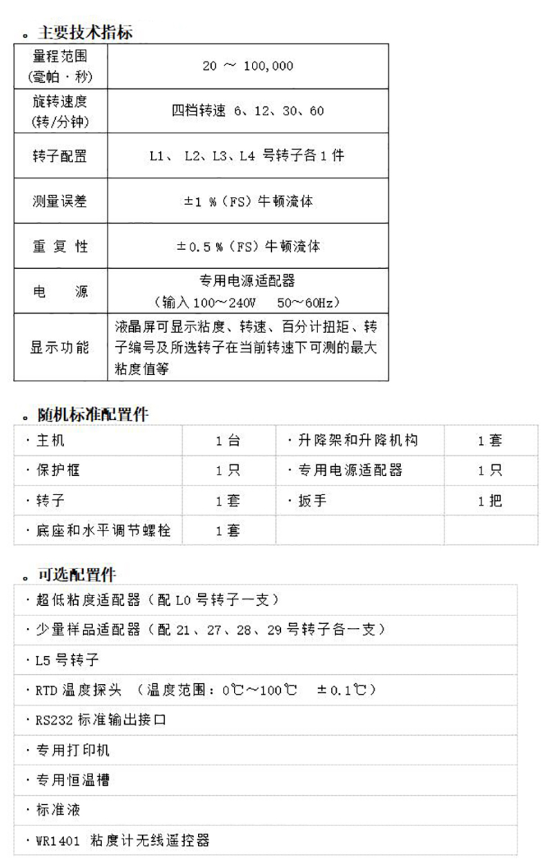 ·采用16位微处理器控制电路,直接显示粘度、转速、扭矩、转子号及可测最大粘度值等,可选配打印机和RTD温度探头。