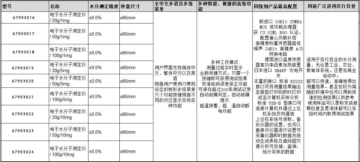 ·用户界面支持简体中文、繁体中文以及英语 ·根据用户使用习惯而设定的树形多级菜单 ·六个功能按键根据不同的对应显示实现各种功能 ·多种工作模式 ·测量过程实时显示 ·全新快捷方式,只需一个按键即可获得测试结果 ·校准砝码误差修正功能 ·可保存超过200条测试记录 ·自动故障判定,自动故障提示 ·超温报警、超高温自动断电功能 ·全新进口低功耗处理器 ·配置偏心负载补偿 ·高精度称重传感器超低噪声24Bit高精度A/D转换电路 ·全新德国进口温度传感器高功率卤素加热装置日本进口SHARP光电开关 ·丰富的接口标准RS232接口可将测量结果输出至微型打印机即时打印或至计算机采样分析 ·标准USB-B型接口可连接计算机并通过上位机系统双向通信 ·上位机系统可读取、备份仪器的设置,也可以直接对仪器进行设置可采集仪器即时数据并自动生成表格及曲线图方便分析可存储、查询、统计采样的数据 ·适用于各行各业的水分测量,无论是工业、农业、教育体系统,还是在商业活动中。 ·都可以快速、准确地得出测量结果。甚至在较为简陋的环境中也可以得到快速的检测结果以供参考 ·被测样品可以是粉末或者颗粒甚至是液体都可以在短时间内取得测试结果