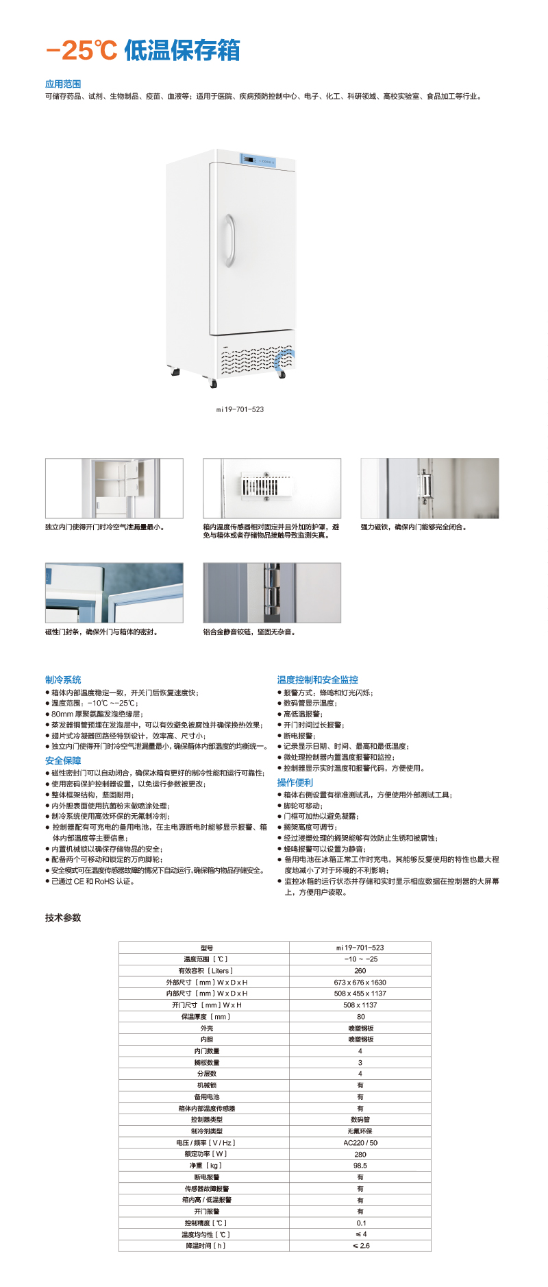 ·制冷系统 ·箱体内部温度稳定一致,开关门后恢复速度快; ·温度范围:-10℃ ~-25℃; ·80mm 厚聚氨酯发泡绝缘层; ·蒸发器铜管预埋在发泡层中,可以有效避免被腐蚀并确保换热效果; ·翅片式冷凝器回路经特别设计,效率高、尺寸小; ·独立内门使得开门时冷空气泄漏量最小,确保箱体内部温度的均衡统一。 ·温度控制和安全监控 · 报警方式:蜂鸣和灯光闪烁; ·数码管显示温度; ·高低温报警; ·开门时间过长报警; ·断电报警; ·记录显示日期、时间、最高和最低温度; ·微处理控制器内置温度报警和监控;