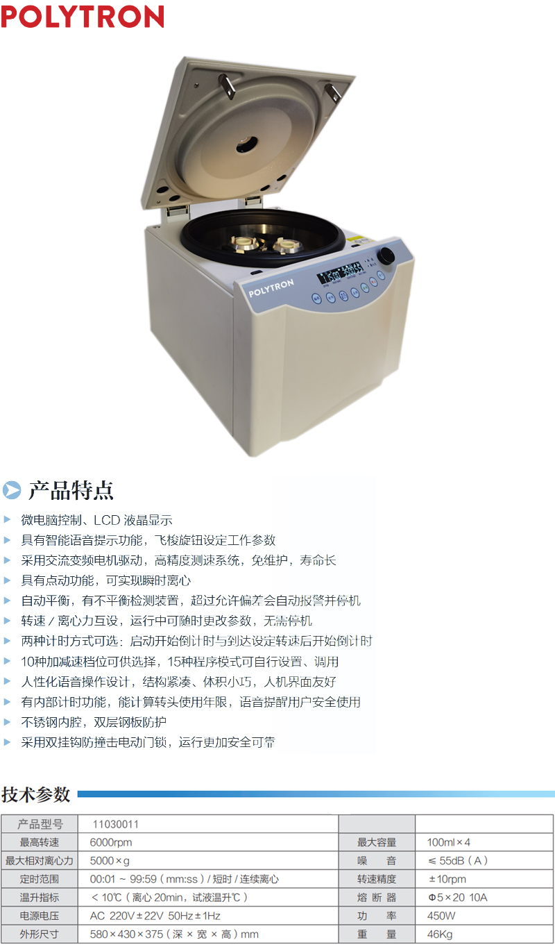 ·微电脑控制、LCD 液晶显示; ·具有智能语音提示功能,飞梭旋钮设定工作参数; ·采用交流变频电机驱动,高精度测速系统,免维护,寿命长; ·具有点动功能,可实现瞬时离心 ·自动平衡,有不平衡检测装置,超过允许偏差会自动报警并停机 ·转速 / 离心力互设,运行中可随时更改参数,无需停机 ·两种计时方式可选:启动开始倒计时与到达设定转速后开始倒计时 ·10种加减速档位可供选择,15种程序模式可自行设置、调用 ·人性化语音操作设计,结构紧凑、体积小巧,人机界面友好 ·有内部计时功能,能计算转头使用年限,语音提醒用户安全使用 ·不锈钢内腔,双层钢板防护 ·采用双挂钩防撞击电动门锁,运行更加安全可靠