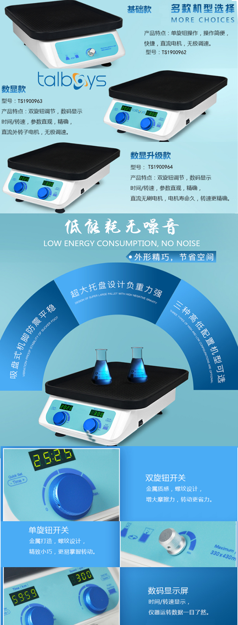 ·数码显示屏:时间/转速显示,仪器运转数据一目了然。 ·吸盘式机脚,超强防震,高速平稳,无噪声