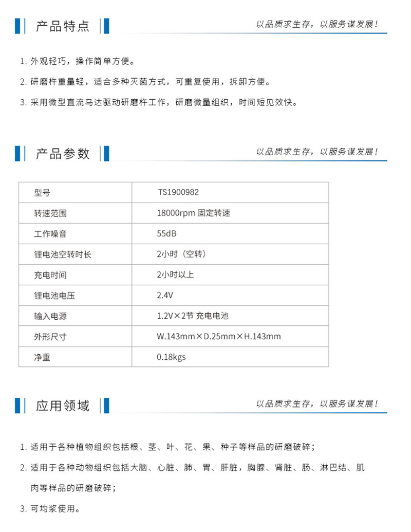 ·迷你手持均质仪外观轻巧,手持式设计,操作简单,采用微型直流马达驱动研磨杵工作,研磨微量组织,时间短见效快。研磨杵重量轻,可重复使用,拆卸方便。