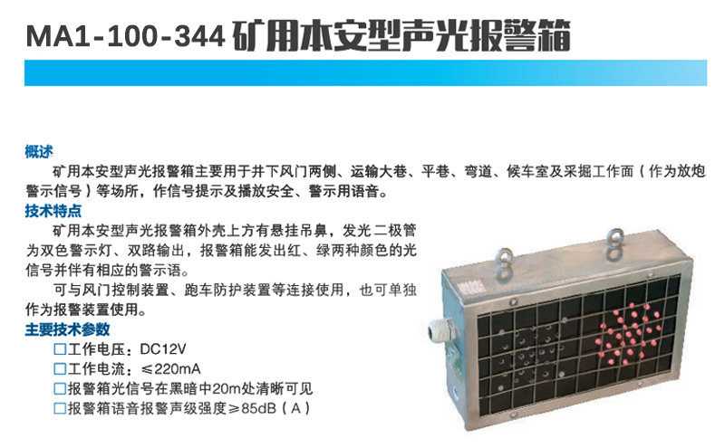 ·矿用本安型声光报警箱外壳上方有悬挂吊鼻,发光二极管为双色警示灯、双路输出,报警箱能发出红、绿两种颜色的光信号并伴有相应的警示语。