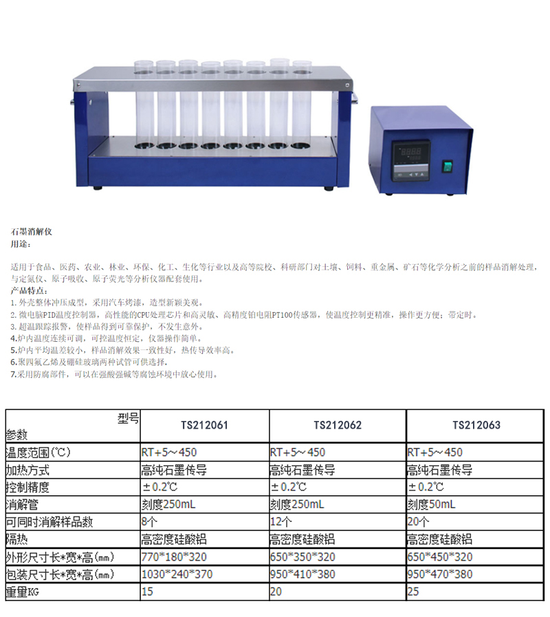 温控RT+5~450℃;可同时消解样品数20个
