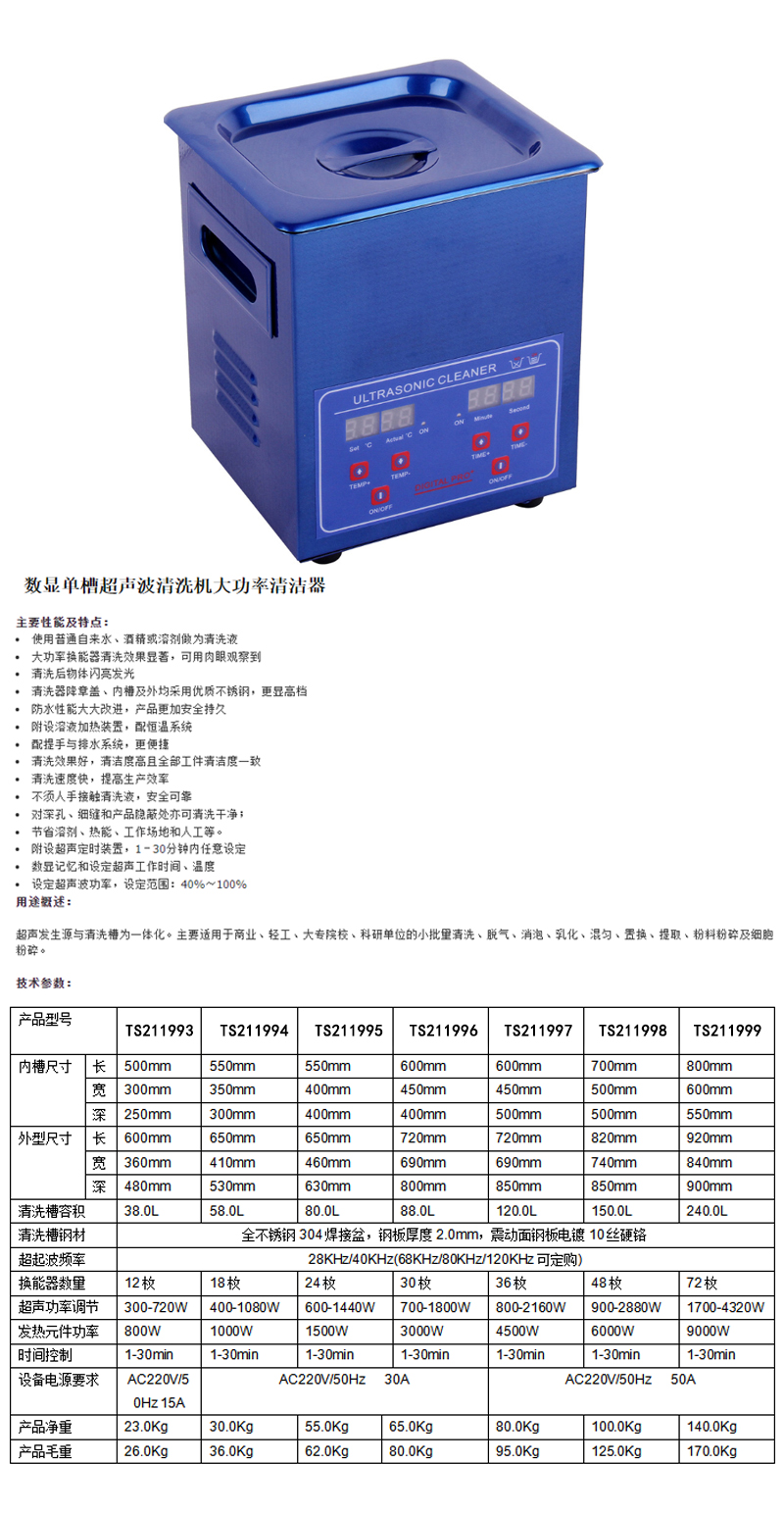 ·采用先进数码芯片,控制温度与时间更为准确 ·使用普通自来水清洗 ·可加温加热,清洗效果好 ·数码液晶可调整温度及使用时间 ·全不锈钢外壳与盖子、内胆 ·医用数控系列超声波清洗机采用LED人机交互界面,数字显示,友好清晰,直观方便,可实现定时、超声功率调节等功能 适用场合: