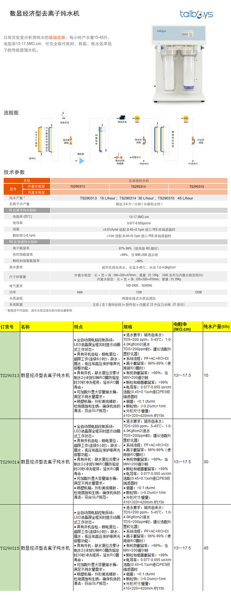H65684 TS290314 30L/h 0.077-0.055 us/cm 选配(0.45+0.1)um进口PES终端滤器时 13~17.5MΩ.cm <0.1 cfu/ml (>0.2/um)<1/ml 410×320×420mm /15kg 9253.00