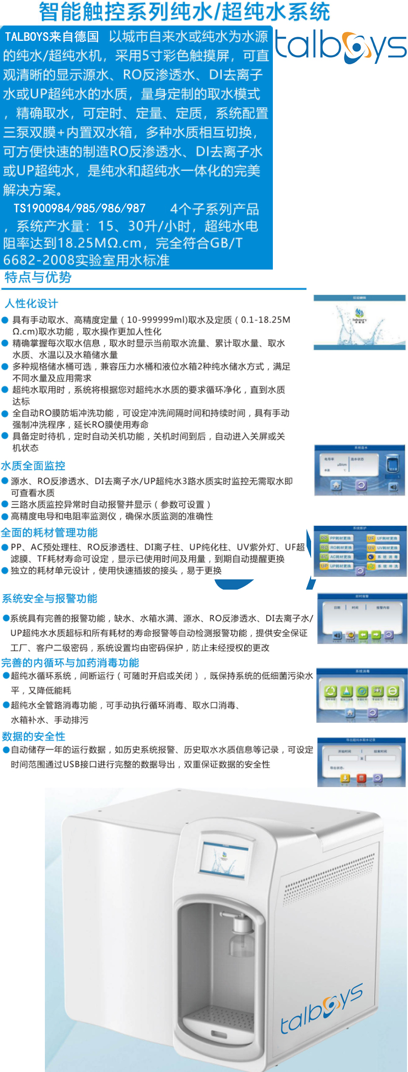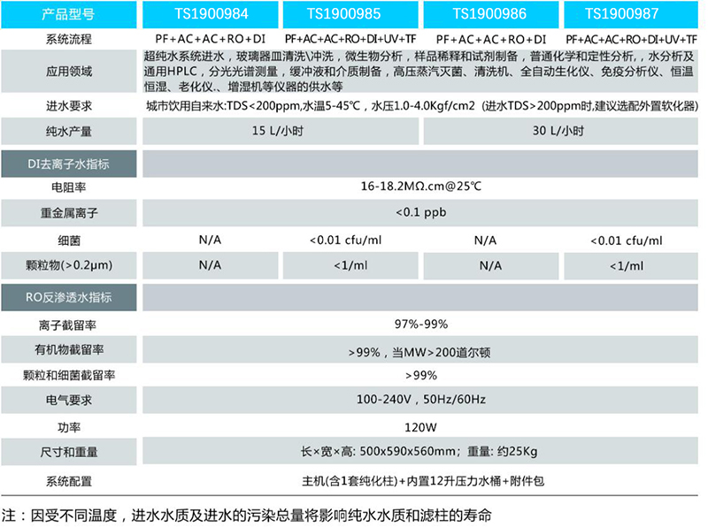 ·超纯水系统进水,玻璃器皿清洗\冲洗,微生物分析,样品稀释和试剂制备,普通化学和定性分析,水分析及通用HPLC,分光光谱测量,缓冲液和介质制备,高压蒸汽灭菌、清洗机、全自动生化仪、免疫分析仪、恒温恒湿、老化仪、增湿机等仪器的供水等。