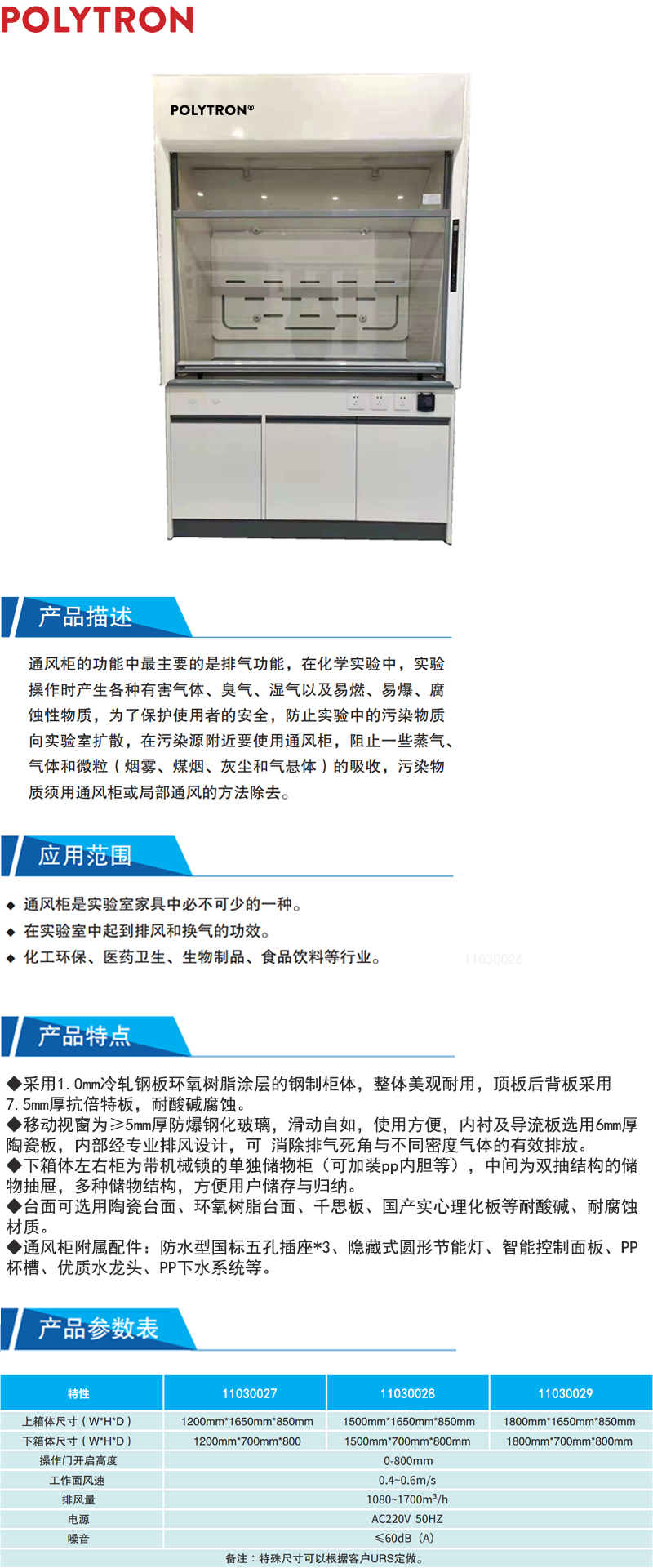 ·通风柜附属配件:防水型国标五孔插座*3、隐藏式圆形节能灯、智能控制面板、PP杯槽、优质水龙头、PP下水系统等。