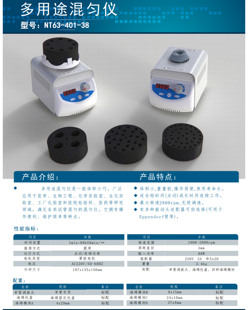 有多种振动头适配器可供选择 标配 单管涡旋头、海绵托盘、四种海绵模块