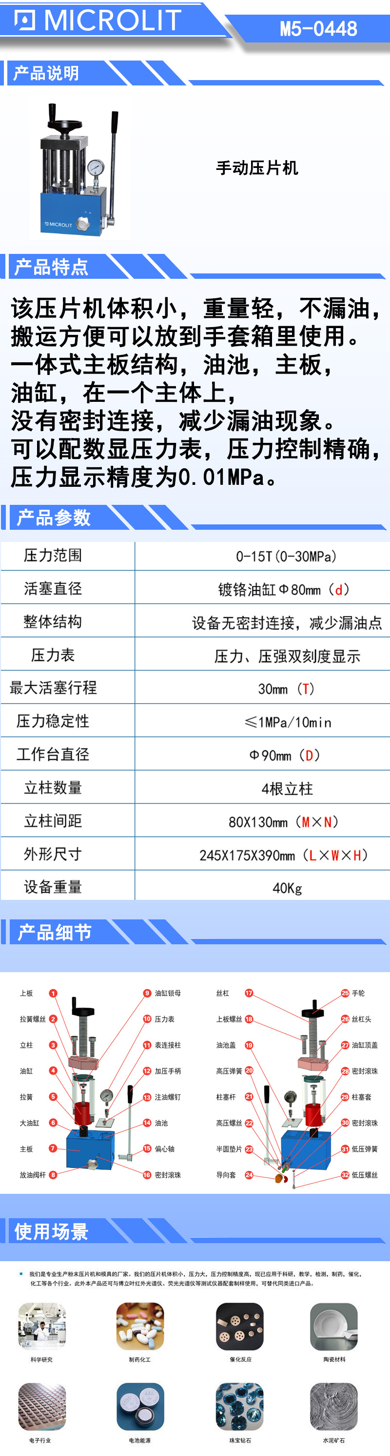 *该压片机体积小,重量轻,不漏油,搬运方便可以放到手套箱里使用 *一体式主板结构,油池,主板,油缸,在一个主体上,美玉米放链接,减少漏油现象。 *可以配数显压力表,压力控制精确,压力显示精度为0.01MPa