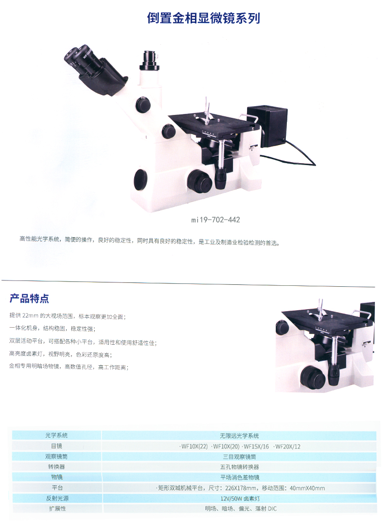 ·无限远色差校正光学系统;成像质量与进口产品相当;标准配置4个镜头,放大倍数:50X,100X,200X,500X,1000X可选配