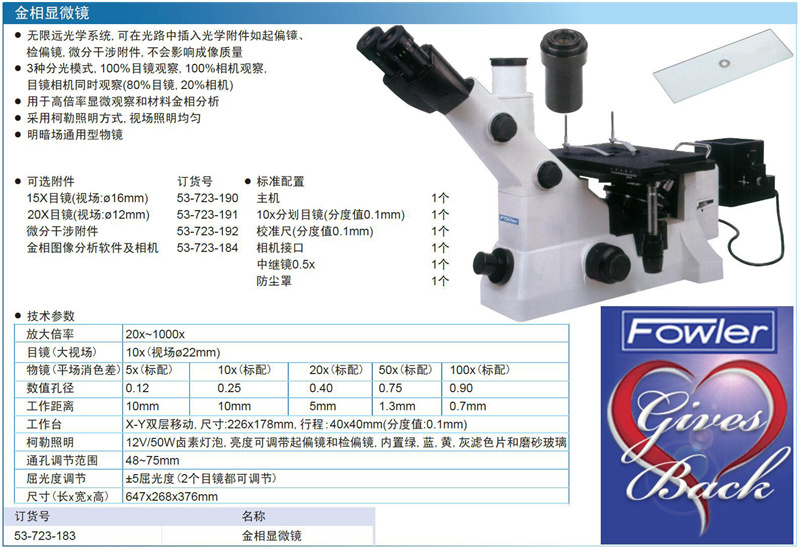 ·可选附件 订货号:15×目镜视场:ø16mm 53-723-190,20×目镜视场:ø12mm 53-723-191,微分干涉附件 53-723-192,金相图像分析软件及相机 53-723-184