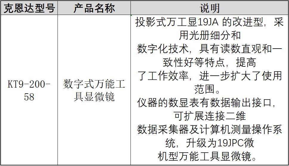 ·投影式万工显19JA 的改进型,采用光册细分和数字化技术,具有读数直观和一致性好等特点,提高了工作效率,进一步扩大了使用范围. ·仪器的数显表有数据输出接口,可扩展连接二维数据采集器及计算机测量操作系统,升级为19JPC微机型万能工具显微镜.