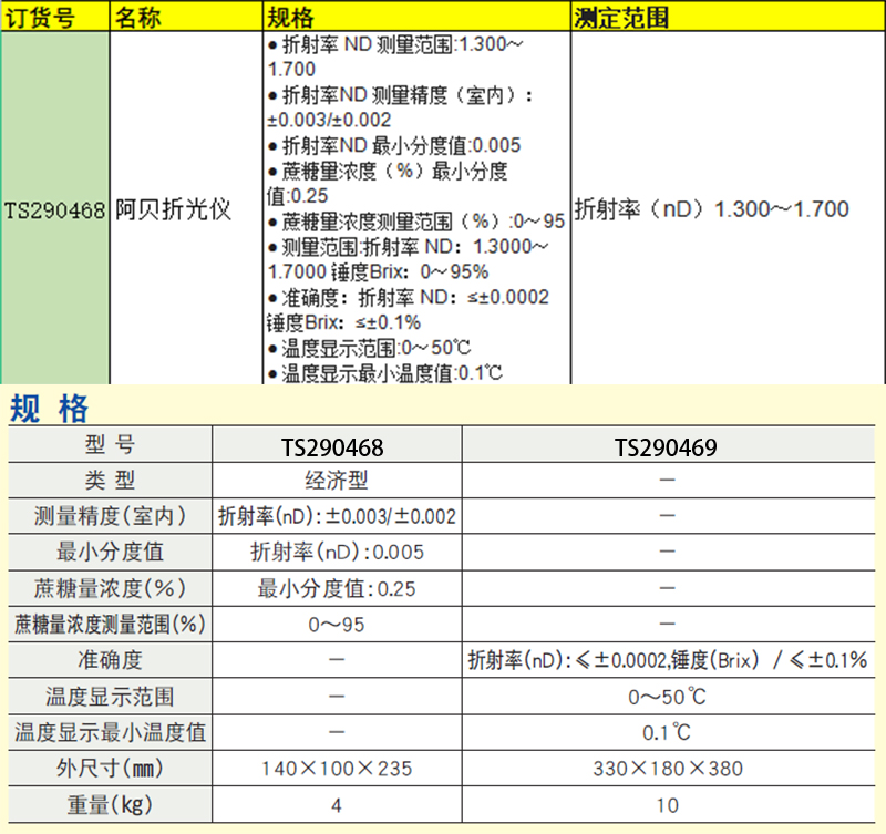 · 折射率 ND 测量范围:1.300~1.700 · 折射率ND 测量精度(室内):±0.003/±0.002 · 折射率ND 最小分度值:0.005 · 蔗糖量浓度(%)最小分度值:0.25 · 蔗糖量浓度测量范围(%):0~95 · 测量范围:折射率 ND:1.3000~1.7000 锤度Brix:0~95% · 准确度:折射率 ND:≤±0.0002 锤度Brix:≤±0.1% · 温度显示范围:0~50℃ · 温度显示最小温度值:0.1℃