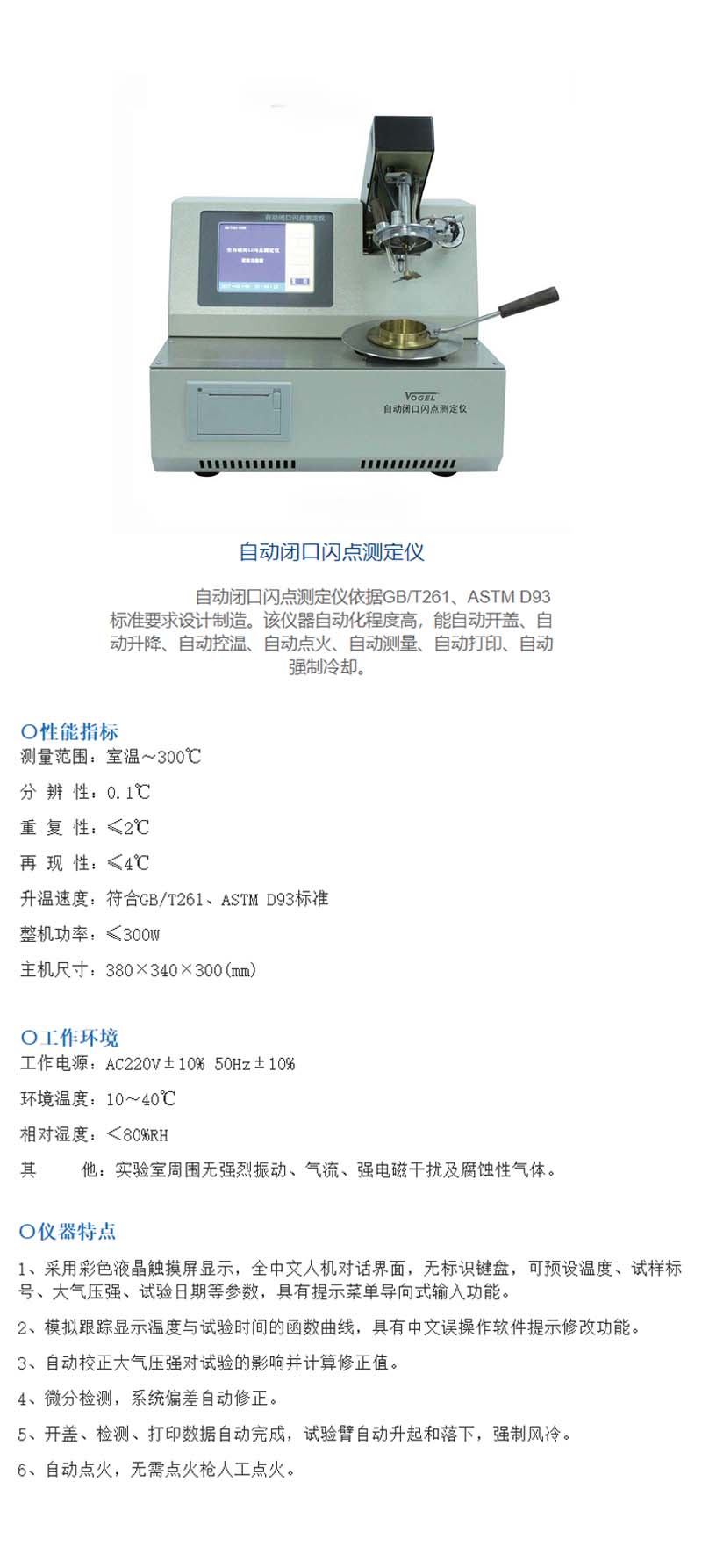 ·采用8英寸彩色高清液晶触摸屏,全中文人机对话界面。 ·可预设温度、试样名称、延后温度等参数。 ·可自定义测试流程,设置升温速率、搅拌速率、点火频率、提前点火温度等参数。 ·精确的模拟跟踪实时显示温度与试验时间的函数曲线,软件具有误操作中文提示修改功能。 ·仪器自带大气压强传感器自动校正大气压强对试验结果的影响。 ·可选快速模式,对陌生试样进行快速预估。 ·电点火与气点火自由切换,操作简单快速方便。 ·全自动旋转升降臂,升降、划扫、检测、打印数据自动完成。 ·强制冷却系统快速为加热系统降温,10分钟内可进行下一次测试。 ·仪器自带智能样杯散热架,根据样杯温度自动启停散热系统。 ·氮化硅点火头自动点火,无需人工使用点火枪点火。 ·具有火苗检测并自动引燃功能,实现智能火苗保持,极大地延长点火头使用寿命。 ·隐藏升降式对置双灭火头,仪器主动检测明火,自动对喷惰性气体两秒内将明火扑灭。 ·可通过USB接口接入LIMS系统。