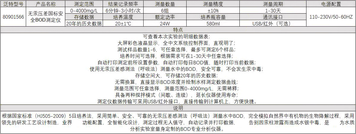 ·可查看本次实验的明细数据表; ·大屏彩色液晶显示,全中文系统控制界面,直观明了; ·测试样品数量1-6,可任意选择,最多可测定6个样品; ·培养时间可选择,根据需求可在1-30天中任意选择; ·自动打印测定前所设置参数,自动打印每日BOD值,随时打印当前数据; ·使用无汞压差感测法(呼吸法)测量水中的BOD,安全可靠,不会发生汞中毒; ·存储空间大,可存储20年的历史数据; ·无需换算,直接显示BOD浓度并绘制水样测定数据曲线; ·测量范围可任意选择,测量范围0-4000mg/L,无需稀释; ·具备两种搅拌模式(间歇、连续),延长仪器使用寿命; ·测定仪数据传输可采用USB/红外接口,直接传输到计算机上,方便快捷。 ·说明:根据国家标准(HJ505-2009)5日培养法,采用简单、安全、可靠的无汞压差感测法(呼吸法)测量水中BOD,完全模拟自然界中有机物的生物降解过程,采用领先的研发工艺设计制造,业界顶级功能配置,全智能化设计,测定过程无人值守,自动记录并打印数据,彻底告别因汞柱泄露而造成水银中毒,是专门为水质分析实验室量身定制的BOD专业分析仪器。