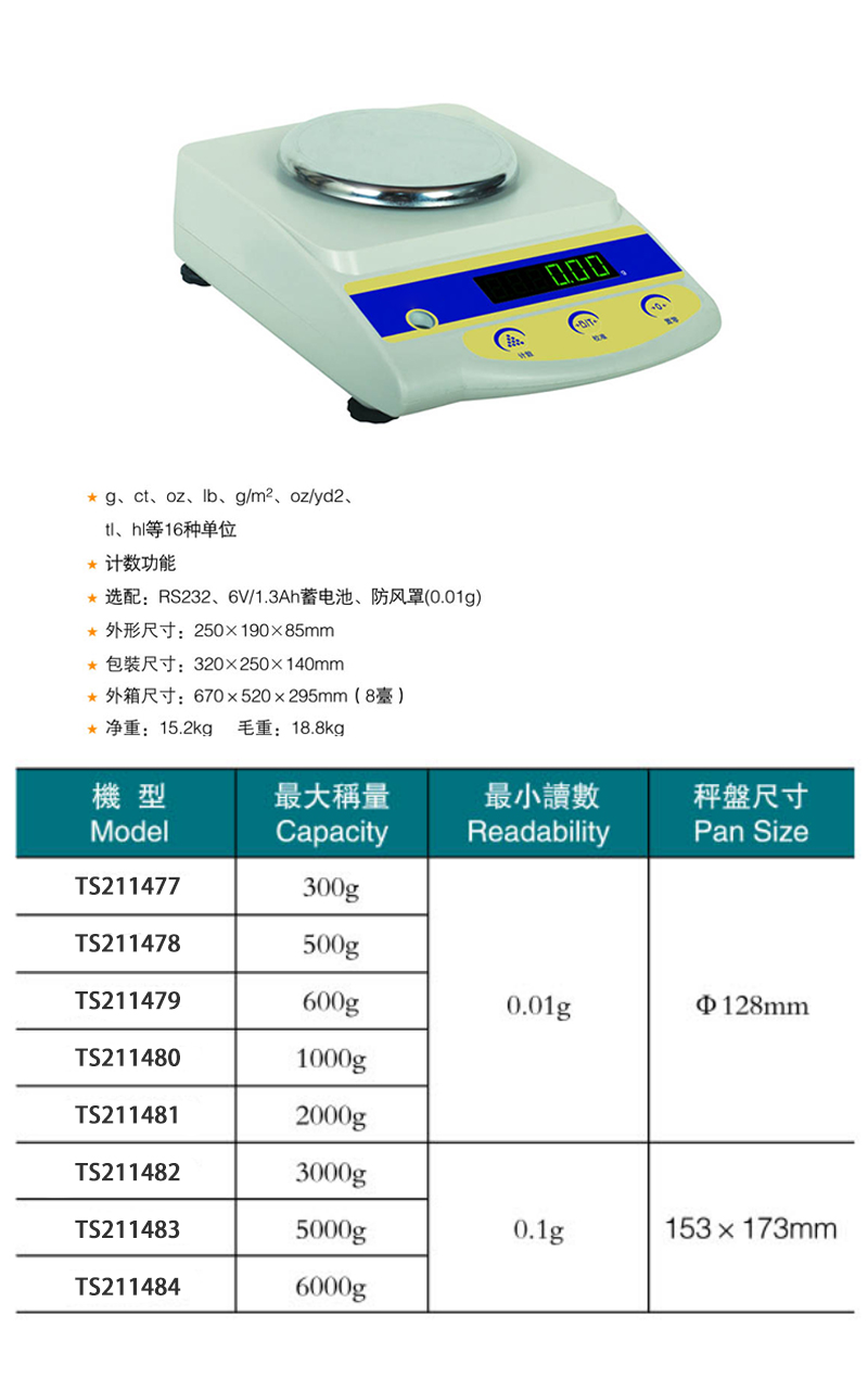 ·交直流两用,带水准仪,液晶背光显示,称量反应速度快,高稳定性。 ·传感器采用独特的锁紧装置,确保天平在运输起到保护作用。 ·系统操作有:计数功能,百分比,自动校准,校准多点选择,配校准砝码(可选)。 ·具有单位转换(米制克拉、金盎司等)、稳定度、记忆功能、动物称重、全量程去皮等多种功能,操作更简便可靠。 ·内置RS232C输出接口,可直接连接计算机、打印机等外部设备。
