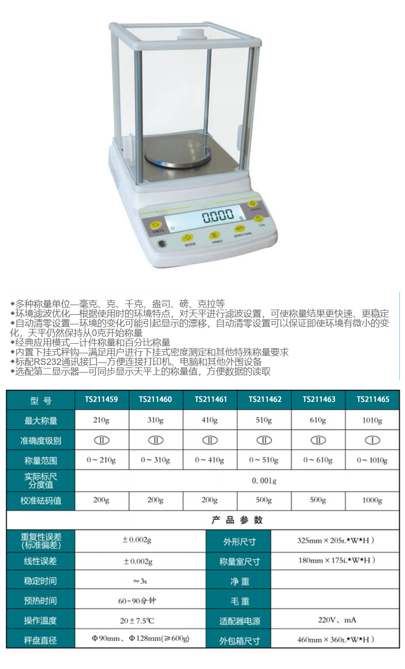 规格:  最大称量210g 制造商型号:  TS211459