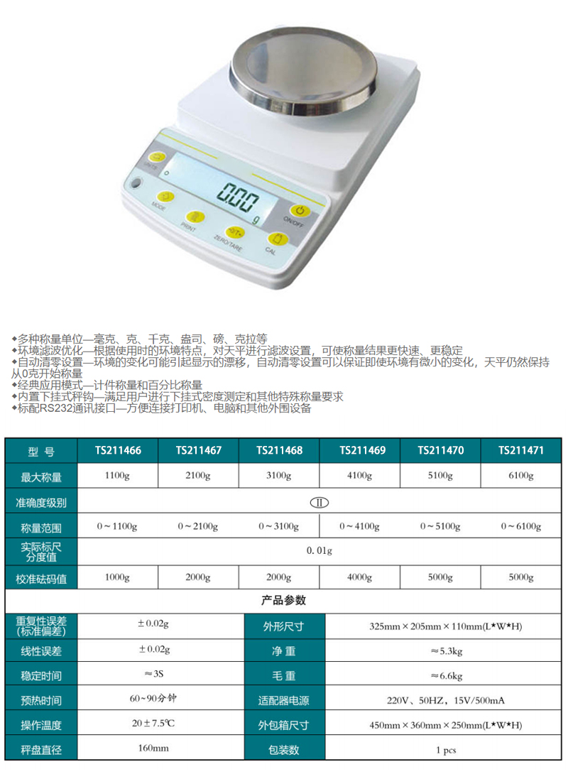 .全金属高强度底座及不锈钢秤盘,耐冲击、耐腐蚀 .采用高稳定性应变式传感器,每个传感器都经过高低温老化处理,确保在交差的工况下依旧可以准确称量 .限位保护装置,确保传感器在超载时不至损坏 .软件系统可针对不同的传感器实现智能匹配,确保产品的一致性 .特别开发的线性及偏载误差补偿系统,能够排除人为造成的称量误差 .采用STN高对比度液晶显示器,显示清晰锐利 .可使用9V干电池供电 .具备多种应用程序及功能 .全量程去皮 .基本称量 .自动回零 .计数功能,且计数样品数可调 .多种单位转换,包括g(克),kg(千克),ct(克拉),oz(盎司),lb(磅) .开机自动检测 .自动校准(外部校准) .线性校准(需配置成套砝码) .配置RS232接口,可连接计算机或者微型打印机 .两种打印输出方式 .故障自动报警 .配置下称钩 .配置水平仪