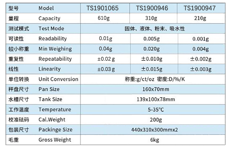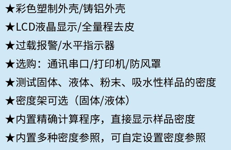 ·彩色塑制外壳/铸铝外壳 ·LCD液晶显示/全量程去皮 ·过载报警/水平指示器 ·选购:通讯串口/打印机/防风罩 ·测试固体、液体、粉末、吸水性样品的密度 ·密度架可选(固体/液体) ·内置精确计算程序,直接显示样品密度 ·内置多种密度参照,可自定设置密度参照