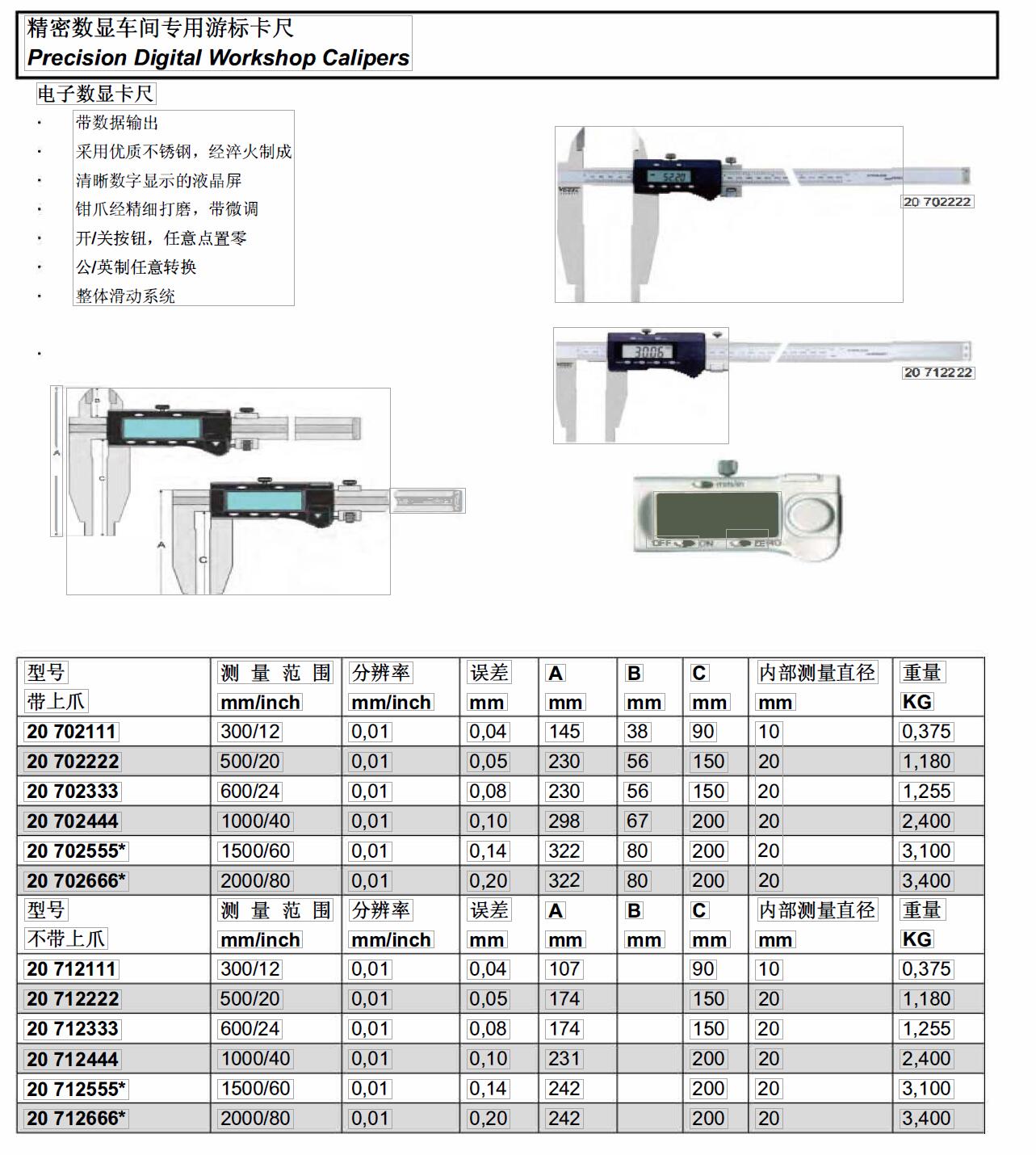 ·带数据输出 ·不锈钢,淬硬,钳爪经精细打磨,带微调 ·清晰数字显示的液晶屏,整体滑动系统 ·开/关按钮,任意点置零,公/英制任意转换 ·喷涂冷却液. 水. 油和灰尘达到 IP66防护水准任意点零设置. ·便于相对和绝对测量转换 ·公/英制任意转换 ·可预设任意点任意阅读 ·带微调的滑动托架