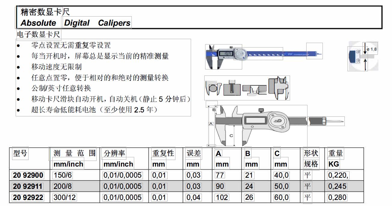 ·移动卡尺滑块自动开机,自动关机(使用5分钟后)
