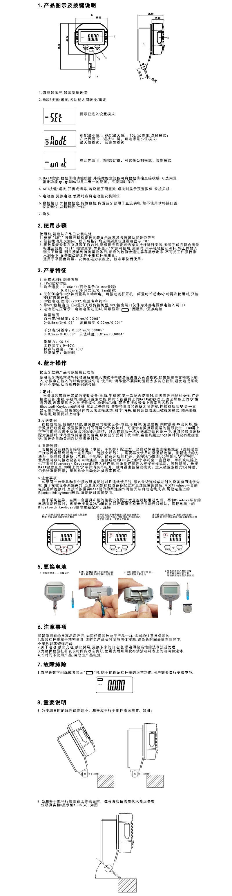 测量范围百分表/分辨率:0.01mm/0.0005"0-0.8mm/0-0.03”示值精度:0.02mm/0.001" 千分表/分辨率:0.001mm/0.00005”0-0.2mm/0-0.008” 示值精度:0.01mm/0.0004 测量力:<0.3N工作温度:0-40C运输:-20-70C球境湿度:无限制