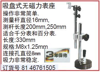 ·吸盘式无磁力表座 ·操作非常简单. ·测量杆直径16mm,测杆长度200mm,250mm长度:330mm规格:M8x1.25mm连接孔直径8mm ·吸力非常稳定.