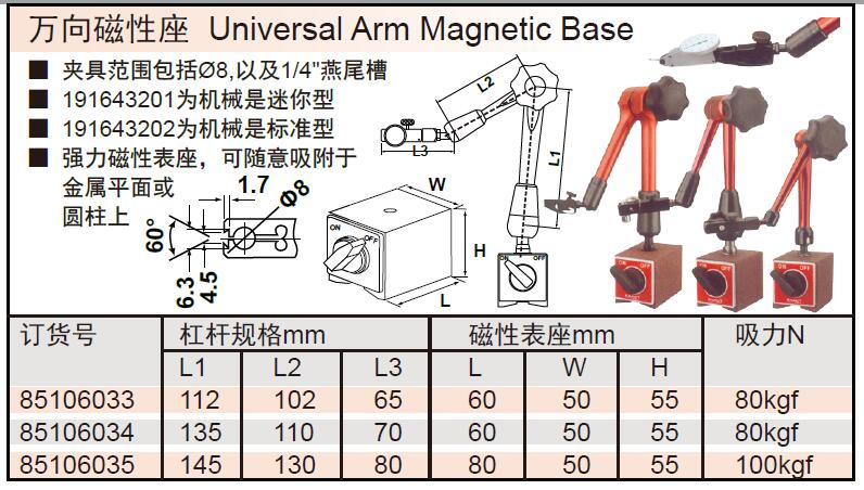 ·夹具范围包括Ø8,以及1/4"燕尾槽 ·强力磁性表座,可随意吸附于金属平面或圆柱上