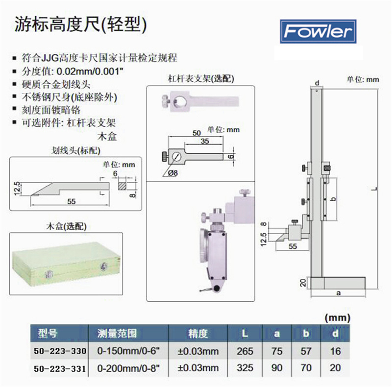 ·分度值;0.02mm/0.001" ·硬质合金化线头 ·不锈钢尺身(底座除外),刻度面镀暗铬 ·可选附件:杠杆表支架