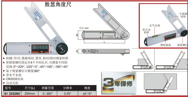 ·按键:开l关,数据保持,置零,相对/绝对测量转换 ·把锁紧螺钉固定在4个不同孔位,可测量不同的 ·范围:0°~225°,-225°~0°,-45°~180°,-180°~45° ·取下锁紧螺钉可测量360° ·带水平水泡 ·CR2032电池
