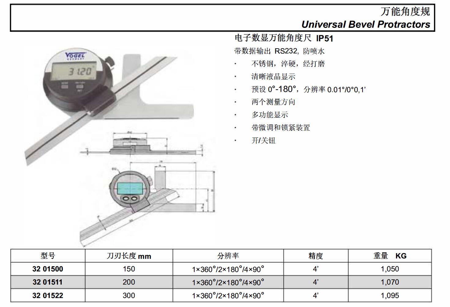 ·不锈钢. 浮硬. 经打磨 ·消晰液晶显示 ·预设 0°-180° . 分辨率 0.01°/0°0.1' 两个测量方向 ·多功能显示 ·带微调和锁紧装置 ·开/关钮