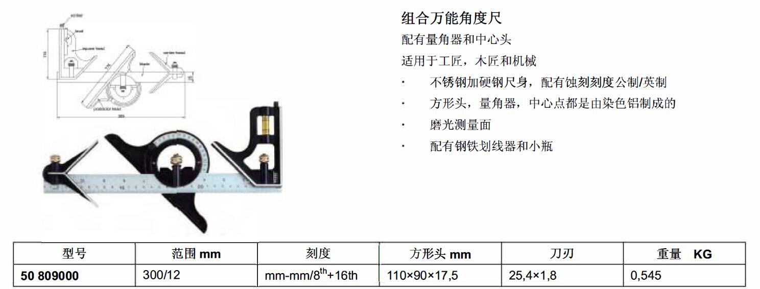 ·不锈钢加硬钢尺身.配有蚀刻刻度公制/英制方形头.量角器.中心点都是由染色铝制成的磨光测量面 ·配有钢铁划线器和小瓶