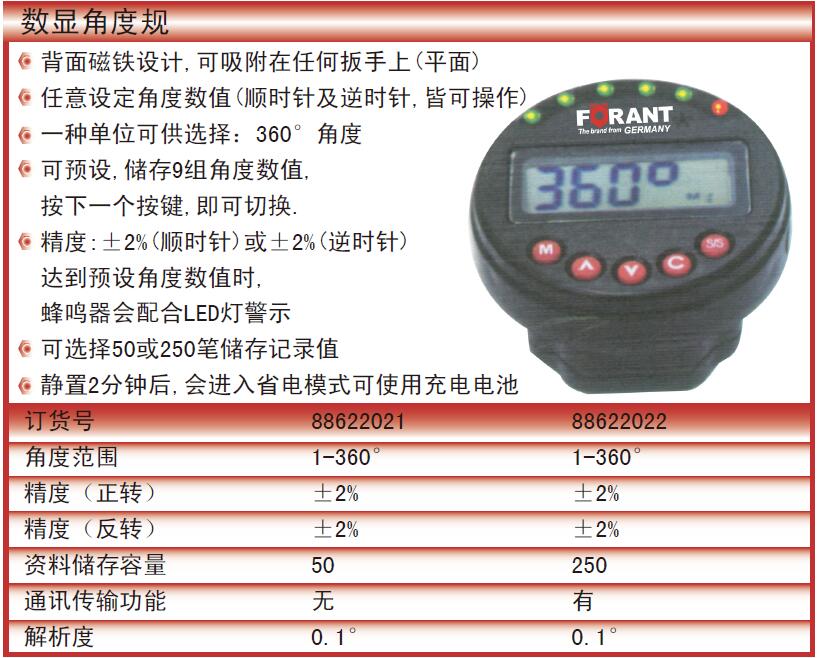 ·背面磁铁设计,可吸附在任何扳手上(平面) ·任意设定角度数值(顺时针及逆时针,皆可操作) ·一种单位可供选择:360°角度 ·可预设,储存9组角度数值, ·按下一个按键,即可切换. ·精度:±2%(顺时针)或±2%(逆时针) ·达到预设角度数值时, ·蜂鸣器会配合LED灯警示 ·可选择50或250笔储存记录值 ·静置2分钟后,会进入省电模式可使用充电电池