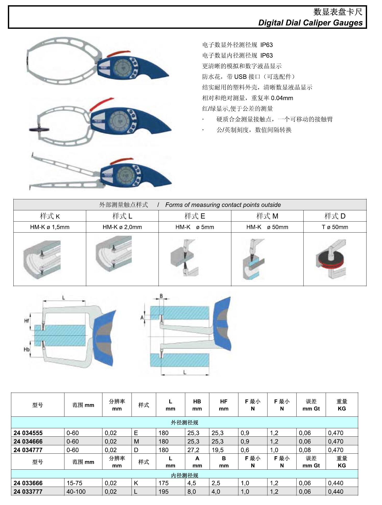 订货号 制造商型号 测量范围 分度值 精度 测量深度 测量槽深度 测量槽宽度 测量力 防护等级 分辨率 样式 L HB HF F.最小N F.最大N 误差 重量 价格 购物车
