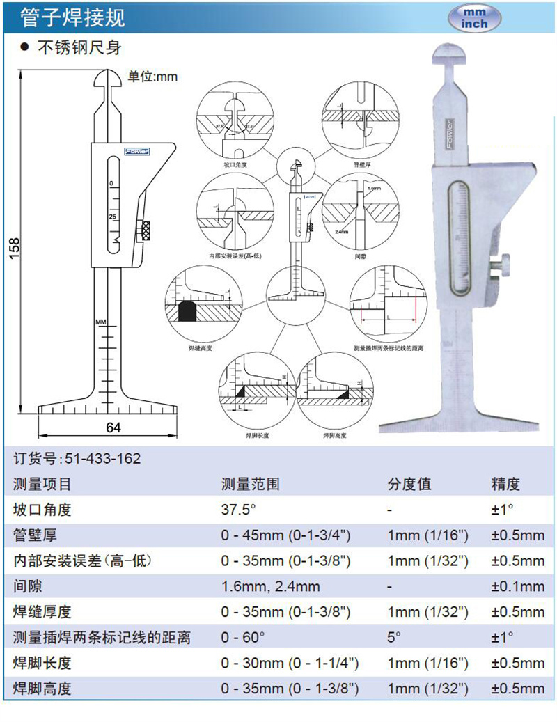 规格:  37.5° 0-45mm0-1-3 4" 0-35mm0-1-3 8" 1.6mm,2.4mm 0-35mm0-1-3 8" 0-60° 0-30mm0-1-1 4" 0-35mm0-1-3 8" 制造商型号:  51-433-162