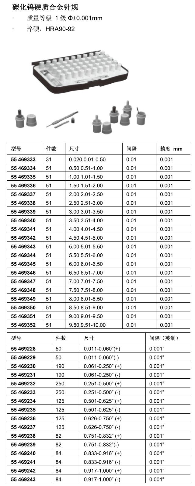 ·组件提供了保护盒. 每个空格都适当标识量规的尺寸每个针脚都经精心研磨. 清晰地标注规定尺寸 0.001mm 公差极限