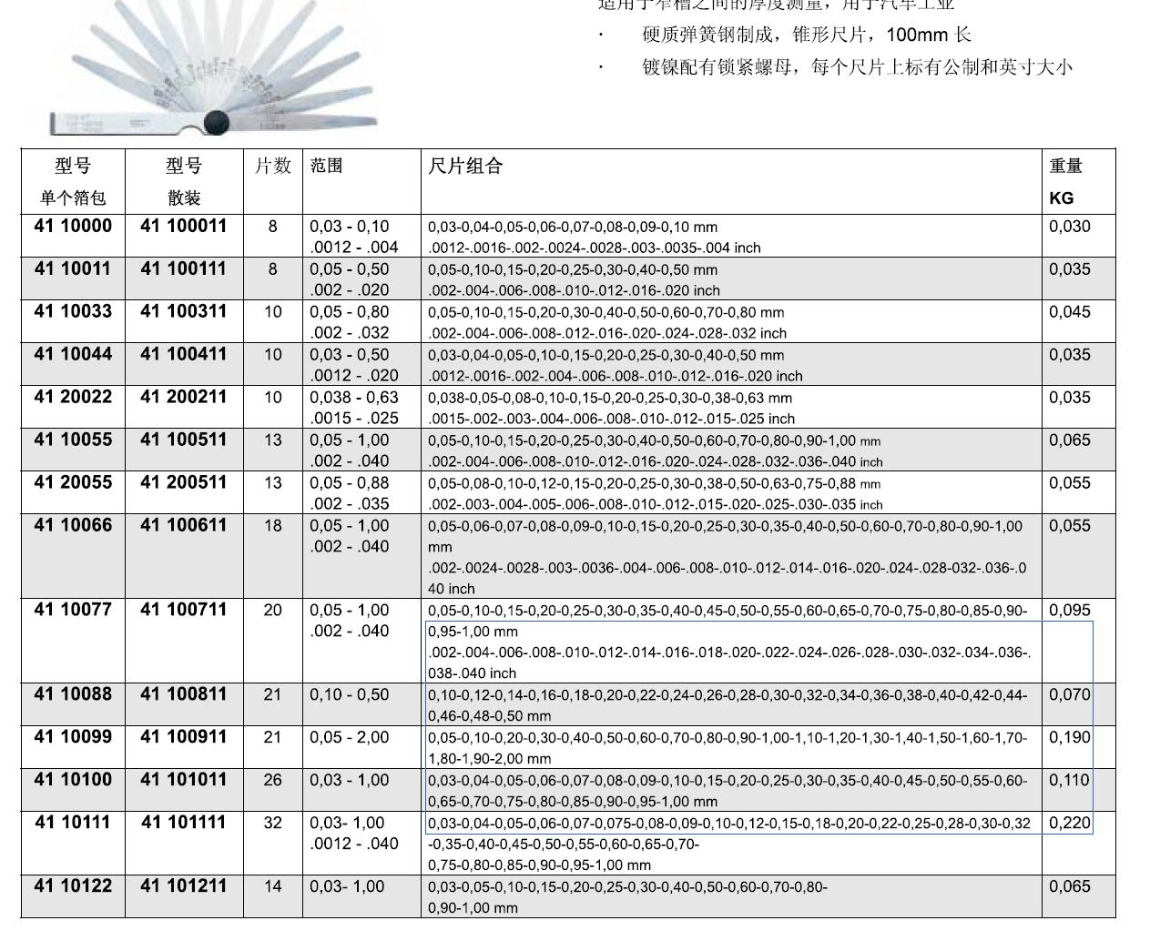 ·适用于窄槽之间的厚度测量,用于汽车工业 ·硬质弹簧钢制成,锥形尺片,100mm长 ·镀镍配有锁紧螺母,每个尺片上标有公制和英寸大小