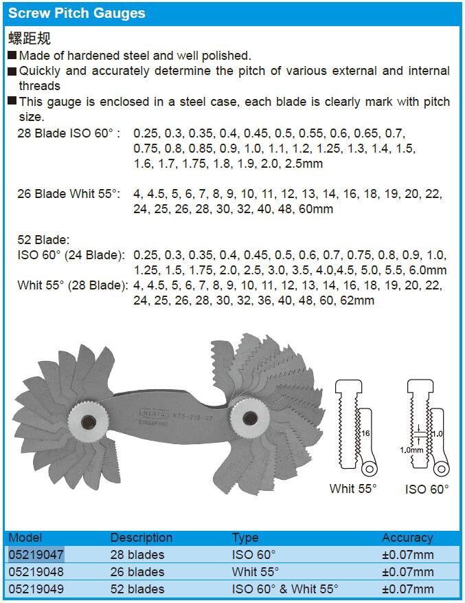 Whit 55 ° (28 Blade): 4, 4.5, 5, 6, 7, 8, 9, 10, 11, 12, 13, 14, 16, 18, 19, 20, 22,24, 25, 26, 28, 30, 32, 36 |