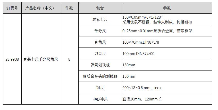 ·组套包含: ·精密游标卡尺 / 0-150 × 0.05 mm;千分尺 / 0-25 mm × 0.01 mm; ·直角尺 / 100 × 70毫米;刀口尺 / 150毫米; ·不锈钢直尺 / 200mm;划线针 / 150mm ; ·冲子 / 120 × ø 10 mm;划线针 / 120mm