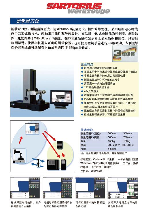 ·应用远心物镜的数码相机系统 ·主轴采用专利技术滚针轴承或真空轴承(选配) ·容易掌握和操作的专用刀具测量软件 ·测量范围至500*500及更大尺寸 ·高品质一体式电脑处理系统 ·19``液晶触摸式显示器 ·40x光学放大 ·适合车间和工厂装备的刀具测量和预调设备 ·PLUS能迅速提供给机床所需要的刀具参数 ·每秒钟可至少测量六组参数可打印、在线传输 ·给机床或刀柄上的可读写芯片 ·配有适合车间使用和易操作的图标式测量软件 ·标准主轴带保护套,可选配真空主轴
