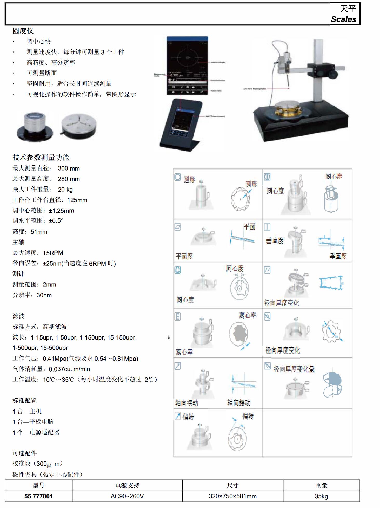 ·技术参数测量功能 ·最大测量直径:300mm ·最大测量高度:280mm ·最大工件重量:20kg ·工作台工作台直径:125mm ·调中心范围:±1.25mm ·调水平范围:±0.5° ·高度:51mm ·主轴 ·最大速度:15RPM ·径向误差:±25nm(当速度在6RPM时)测针 ·测量范围:2mm ·分辨率:30nm ·滤波 ·标准方式:高斯滤波 ·波长:1-15upr.1-50upr.1-150upr.15-150upr.1-500upr.15-500upr ·工作气压:0.41Mpa(气源