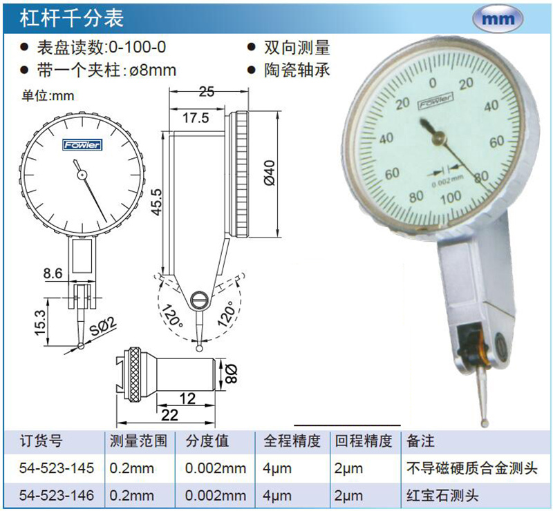 ·表盘读数:0-100-0·双向测量 ·带一个夹柱:ø8mm·陶瓷轴承