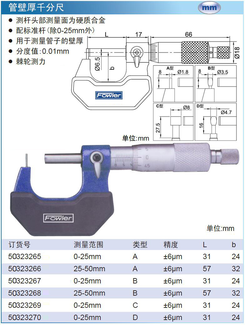 FOWLER 管壁厚千分尺 50323270 0-25mm