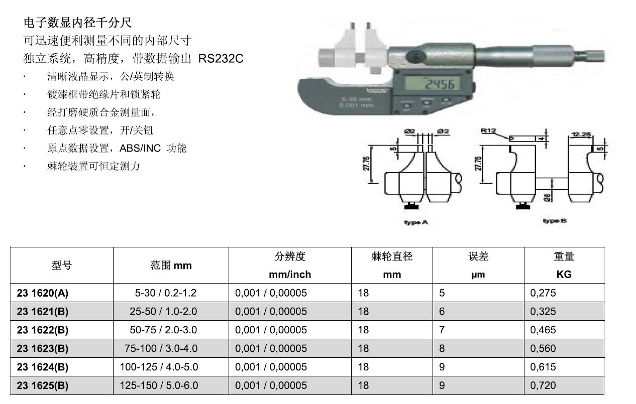·清晰液晶显示,公/英制转换 ·镀漆框带绝缘片和锁紧轮,经打磨硬质合金测量面 ·任意点零设置,开/关钮 ·原点数据设置,ABS/INC功能 ·棘轮装置可恒定测力