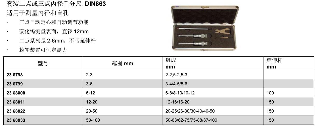 ·套装二点或三点内径于分尺 DIN863适用于测戳内径和盲孔 三点自动定心和自动调节功能碳化鸽测量表面. ·直径 12mm 二点系列是 2-6mm. 不带延伸杆棘轮装置可恒定测力