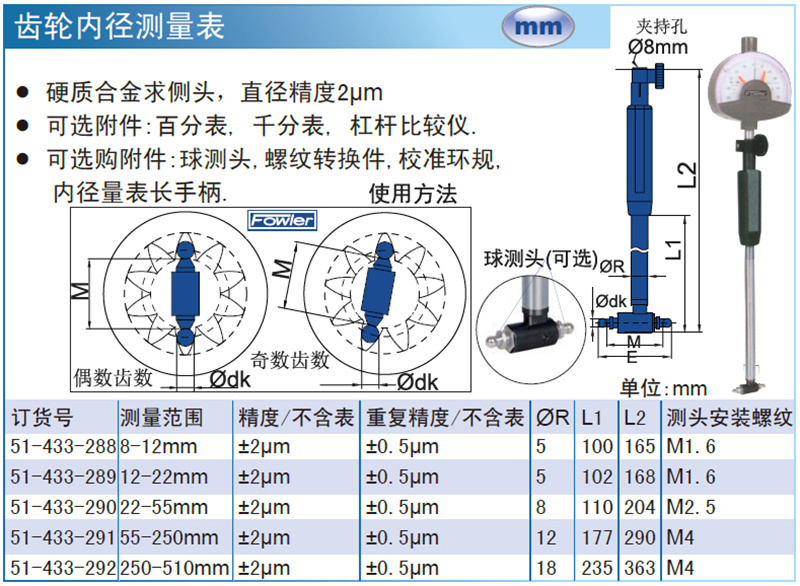 ·硬质合金求侧头,直径精度2μm ·可选附件:百分表, 千分表, 杠杆比较仪. ·可选购附件:球测头,螺纹转换件,校准环规,