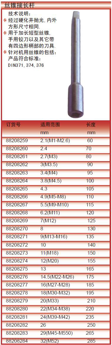 ·技术说明: ·经过硬化并抛光,内外方形尺寸相同. ·用于加长短型丝锥,手用铰刀以及其它带有四边形柄部的刀具. ·针对机用丝锥的包括:产品符合标准:DIN371,374,376